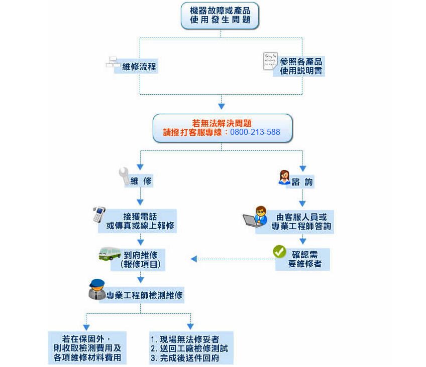 | 預約服務 | 提早一日預約 | 網路報修+電話報修 | 按預約時間前往維修服務 |